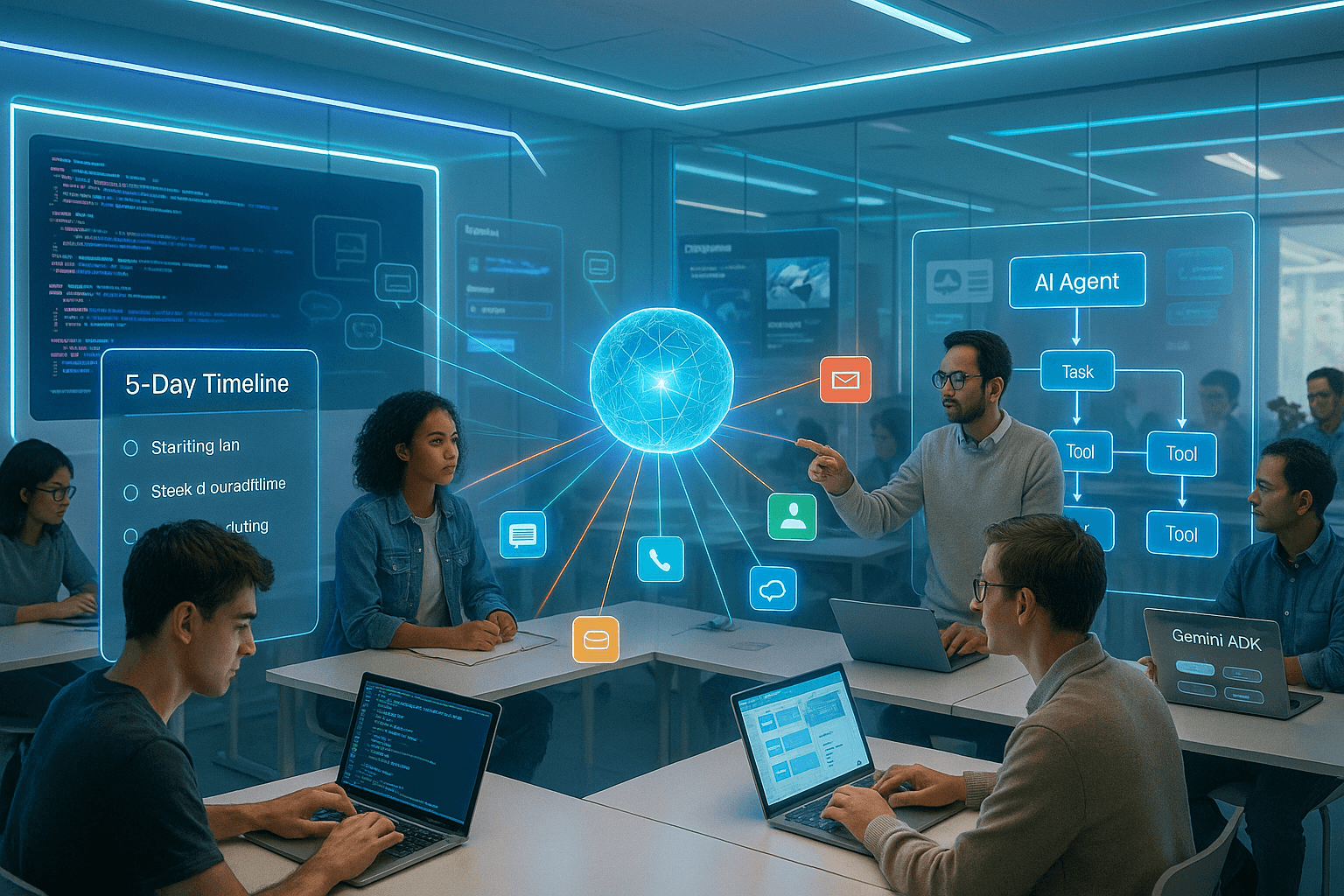Participants learn how to create AI agents from simple prototypes to multi-agent systems using tools like Gemini ADK.